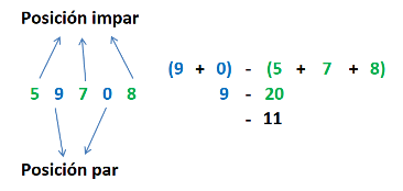 Un número es divisible entre 11 cuando la suma de las cifras que ocupan una posición par menos la suma de las cifras que ocupan una posición impar es igual a un número múltiplo de 11 ó cero (0).